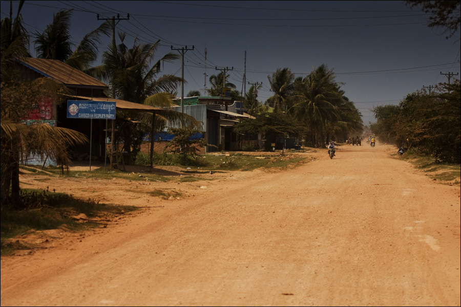 Автобус выехал на трассу, привычная дорога исчезла, и началось просто движение в направлении Сиемреапа. Мы, как есть, мчались вперёд в облаке оранжевой пыли. Водитель гнал автобус по полям, похоже, целясь в несколько пальм впереди, как в ориентир. Или по просёлку, взявшему на себя роль соединять два самых крупных города в стране.