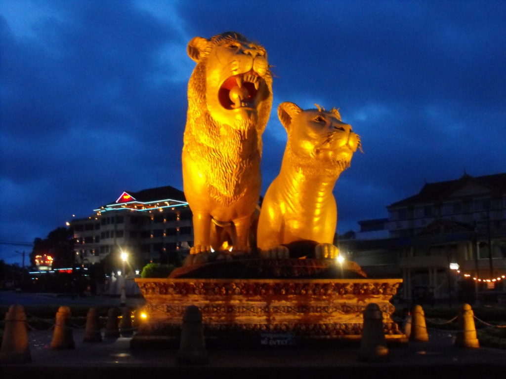Ночевать в Сиануквиле дорого и бессмысленно. Находим турагентство, чтобы узнать, как можно добраться в Сиемреап. Автобусы сегодня уже не отправляются, и девушка предлагает взять такси до Пномпеня за 110$, а оттуда в Сиемреап уехать проще. Договорившись, на круговом перекрёстке дожидаемся Этьена и его новую подругу Джейд. В центре перекрёстка установлен памятник жертвам таксидермии в виде двух огромных страшных львов. За нами приезжает такси. Закидываем рюкзаки в багажник. Саша, Бекки, Этьен и Джейд садятся сзади, а я как победитель чемпионата по росту сажусь спереди. Машина трогается.